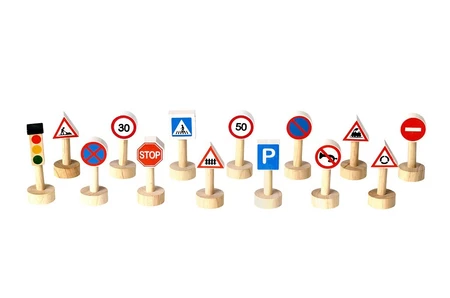 Znaki pasują do wszelkich zabaw związanych z ruchem drogowym, to uniwersalna, wykonana z drewna kauczukowego pomoc w rozwoju Twojego dziecka.