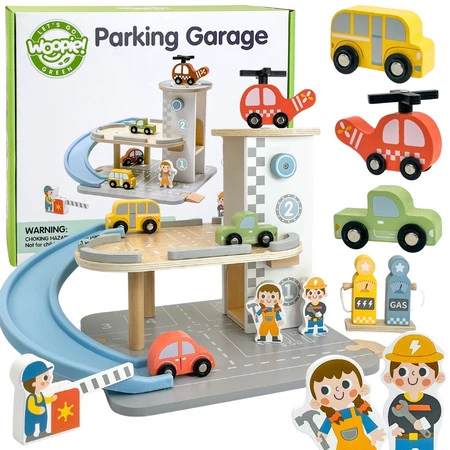 Wielopoziomowy drewniany parking marki Woopie Green to marzenie każdego małego miłośnika samochodów. Ta wyjątkowa zabawka oferuje mnóstwo możliwości kreatywnej zabawy. Kolorowe drewniane samochody zjeżdżają po niebieskiej zjeżdżalni, helikopter z obrotowym śmigłem ląduje na szczycie wieży, a figurki pracowników dbają o porządek i obsługują stację benzynową. Solidna drewniana konstrukcja w subtelnych, pastelowych kolorach świetnie wygląda w pokoju dziecka