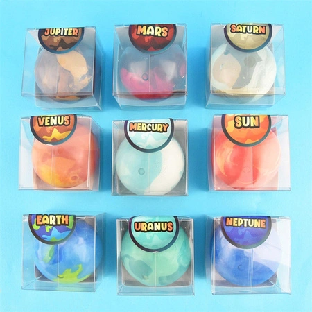 Do wyboru jest 9 gniotków ( 6 cm) planet: Ziemia, Jowisz, Mars, Saturn, Wenus, Merkury, Uran, Neptun i gwiazda Słońce. Gniotki są wysokiej jakości, wykonane z dbałością o szczegóły. Są odpowiedniej wielkości do dłoni dziecka. Odporne na mocne ściskanie i ugniatanie. Gniotki te, są wykorzystywane w terapii sensorycznej. Mają działanie uspokajające i odstresowujące. Są również świetnym narzędziem w terapii ręki, świetnie rozwijają zmysł dotyku oraz wpływają na rozwój małej motoryki. Pełnią funkcje poznawcze.