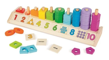 - W zestawie 55 kolorowych elementów w różnych kształtach i 10 płytek z cyframi;