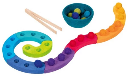 Gra w sortowanie kolorów i Spirala to zabawka składająca się m.in. z 8 częściowej spirali stworzonej na bazie wysokiej jakości drewna klonowego. Jest to gra umożliwiająca zabawę na wiele sposobów. Może to być klasyczna gra w sortowanie kolorów, w której dzieci mogą w zabawny sposób zanurzyć się w świecie kolorów i liczenia. Z kolei podnoszenie i sortowanie kulek z filcu wełnianego do pasujących wgłębień za pomocą szczypiec wykonanych z drewna bukowego promuje koncentrację i trenuje koordynację oko-ręka.