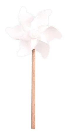 Wiatraczek o szerokości 12 cm i wysokości 30 cm z białymi skrzydełkami (tworzywo) umocowany na drewnianym patyczku. Prosta zabawka lubiana zarówno przez dzieci jak i dorosłych. Często używany również do ćwiczeń logopedycznych i sensorycznych. Wspaniały umilacz spacerów z wózkiem, jazdy na rowerze oraz gadżet dekoracyjny zarówno wewnątrz jak i na zewnątrz.