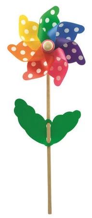 Wiatraczek o szerokości 21 cm i wysokości 58 cm z kolorowymi, tęczowymi skrzydełkami (tworzywo) umocowany na drewnianym patyczku z listkami. Prosta zabawka lubiana zarówno przez dzieci jak i dorosłych. Często używany również do ćwiczeń logopedycznych i sensorycznych. Wspaniały umilacz spacerów z wózkiem, jazdy na rowerze oraz gadżet dekoracyjny zarówno wewnątrz jak i na zewnątrz.