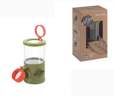 Wysoki (15 cm), wygodny, dwukomorowy przeźroczysty pojemnik z lupami powiększającymi, wbudowanym lusterkiem i pochylnią, aby urozmaicić poznawanie oglądanego zwierzątka.