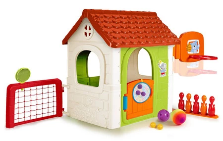 FEBER Dom Aktywności Wielofunkcyjny Domek 6 w 1 z Dołączonymi Grami to pierwszy domek do zabawy, który ma dołączone 6 gier, dzięki którym Twoja pociecha nie będzie wiedzieć co to nuda! Zestaw zawiera gry takie jak: kręgle, gry rakietowe, piłka nożna, koszykówka (z regulowanym koszem), tarcza do piłek na rzep. Po zakończonej zabawie można wszystko złożyć i nie ma bałaganu! Domek solidnie zbudowany, bardzo łatwy w montażu. Dodatkowo wyposażony w system ochronny przed promieniowaniem UV chroniący kolor przed wyblaknięciem. Przeznaczony dla dzieci powyżej 3 roku życia.