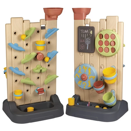 - - Zawiera 6 aktywności: zabawy wodne, gra w kółko i krzyżyk, tablica do pisania kredą, sportowe koło, gra w rzucanie piłką oraz interaktywne elementy do tworzenia własnych torów wodnych.