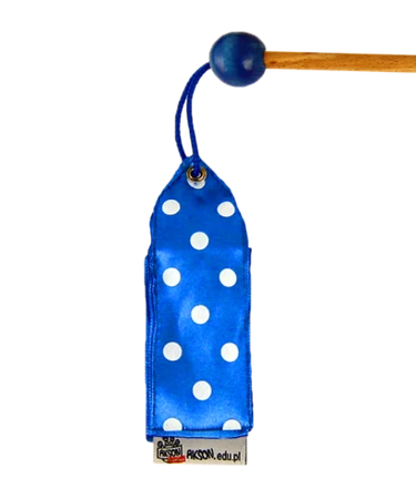 Wstążka gimnastyczna Junior jest starannie wykonana, a co najważniejsze jest bezpieczna, nie posiada żadnych metalowych elementów, ani ostrych zakończeń. Część materiałowa wykonana jest z błyszczącej, niebieskiej taśmy w białe groszki o długości 1,5 m. Materiał połączony jest z drewnianą tyczką kolorowym sznureczkiem, a tyczka zakończona jest po obu stronach drewnianymi kulkami, dzięki czemu wstążka idealnie pasuje do małych rączek i jest wygodna i bezpieczna w użytkowaniu.