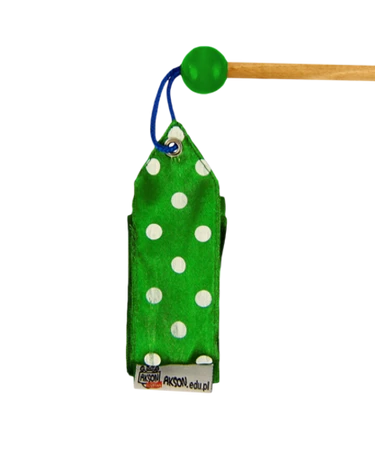 Wstążka gimnastyczna Junior jest starannie wykonana, a co najważniejsze jest bezpieczna, nie posiada żadnych metalowych elementów, ani ostrych zakończeń. Część materiałowa wykonana jest z błyszczącej, zielonej taśmy w białe groszki o długości 1,5 m. Materiał połączony jest z drewnianą tyczką kolorowym sznureczkiem, a tyczka zakończona jest po obu stronach drewnianymi kulkami, dzięki czemu wstążka idealnie pasuje do małych rączek i jest wygodna i bezpieczna w użytkowaniu.