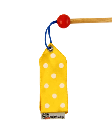 Wstążka gimnastyczna Junior jest starannie wykonana, a co najważniejsze jest bezpieczna, nie posiada żadnych metalowych elementów, ani ostrych zakończeń. Część materiałowa wykonana jest z błyszczącej, żółtej taśmy w białe groszki o długości 1,5 m. Materiał połączony jest z drewnianą tyczką kolorowym sznureczkiem, a tyczka zakończona jest po obu stronach drewnianymi kulkami, dzięki czemu wstążka idealnie pasuje do małych rączek i jest wygodna i bezpieczna w użytkowaniu.