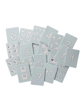 Karty Scrunch do zabawy i nauki cyfr oraz liczenia. W zestawie znajduje się 20 kart, z czego 10 to karty liczbowe, na których nadrukowane są liczby od 1 do 10. Pozostałe 10 kart, ma ilustrację ze zwierzętami w ilościach odpowiadających zapisom na kartach liczbowych. Świetnie sprawdzą się do zapoznawania dzieci ze światem liczb, można je również wykorzystać do gry w memory lub jako puzzle dwuelementowe. Wykonane są z bezpiecznego silikonu, który przykleja sie do gładkich, mokrych powierzchni, takich jak wanna czy kafelki. Idealne do zabawy na plaży, w domu oraz podczas kąpieli.