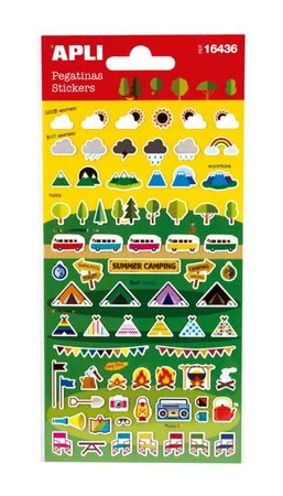 Zestaw naklejek Apli Kids z motywem kempingu. Doskonale sprawdzą się do ozdobienia zeszytów, książek, laurek, albumów, zaproszeń na urodziny, itp. Arkusz składa się z 73 matowych naklejek jednorazowego użytku. Zabawa naklejkami to świetny sposób na rozwijanie małej motoryki, pobudzenie kreatywności, pomysłowości i zdolności narracyjnych.