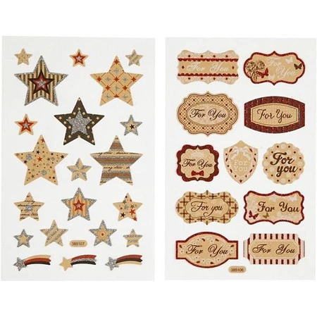Papierowe naklejki w dwóch tematykach z klejem do papieru. W odcieniach sepii, styl retro. Detale naklejek są pokryte brokatem. Samoprzylepne na różne gładkie powierzchnie. Idealne do ozdobienia zeszytów, kartek okolicznościowych, albumów ze zdjęciami, pamiętników itp. Jeśli chcemy je trwale przykleić do powierzchni porowatych (np. drewno) warto użyć dodatkowo kleju odpowiedniego do używanego materiału (świetnie sprawdzają się kleje uniwersalne, np. do decoupage). Nieodpowiednie dla dzieci w wieku poniżej 36 miesięcy. 4 arkusze w 2 wzorach o wymiarach około 10x16 cm. Made in Taiwan.Podmiot odpowiedzialny za ten produkt na terenie UE