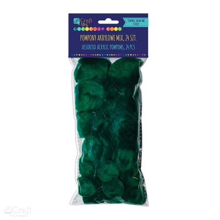- Komplet 24 sztuk różnej wielkości pomponów akrylowych w kolorze ciemno zielonym.