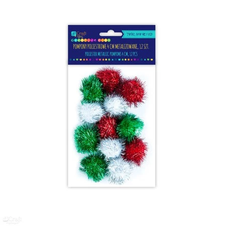 - Komplet 12 sztuk błyszczących pomponów w kolorach świątecznych: czerwonym, białym i zielonym. Wszystkie pompony mają średnicę 4cm.