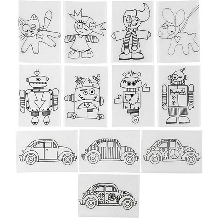 - Zestaw 36 arkuszy folii termokurczliwej w formacie A6 (około 14,5 x 10,5 cm) z nadrukowanymi wzorami tematycznymi. 3 tematy: stworki, roboty i samochody.
