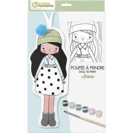 Zawartość: 1 bawełniana lalka, ok. 29 cm. - 1 pędzel - 6 pojemników z farbą - 1 pompon