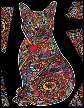 Wypukłe linie ułatwiają nie wychodzenie za linie, a na głębokiej matowej czerni nie widać drobnych potknięć przy kolorowaniu. Welwet nałożony jest na papier przyklejony do sztywnej tektury, dzięki czemu obraz nie wymaga ramki jeśli zdecydujemy się go powiesić na ścianie.