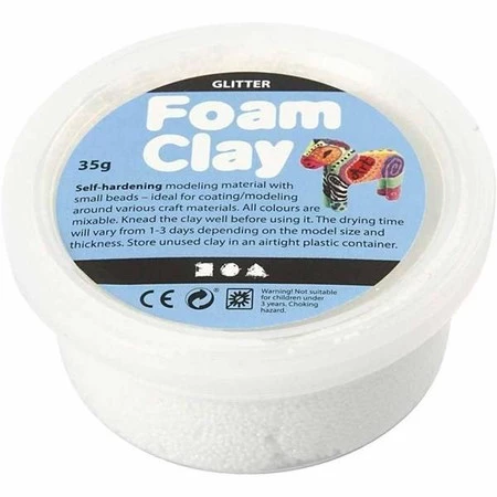 - Brokatowa masa Foam Clay w kolorze białym. Pojemniczek zawiera 35 g masy.
