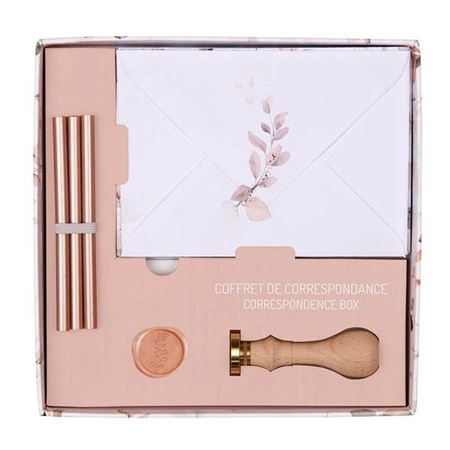- Ten zestaw do lakowania zawiera 20 kopert z akwarelowym wzorem eukaliptusa w kolorze różowym, drewniana rączkę z pieczęcią z motywem eukaliptusa oraz 3 pałeczki laku w kolorze pudrowego różu.