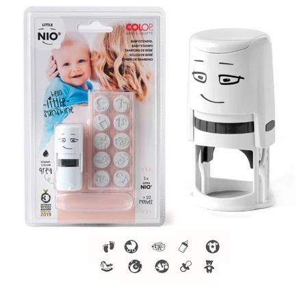 - Samotuszująca pieczątka Little NIO z 10 wymiennymi wzorami z okazji narodzin dziecka.
