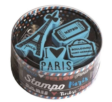- Stempelki Prezencik Paryż. Zestaw 4 gumowych stempelków z piankowymi rączkami.