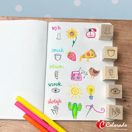 Z pomocą stempli dziecko nauczy się dopasowywać elementy otoczenia do danego zmysłu, np. kwiat- węch, słońce- wzrok, pizza- smak.