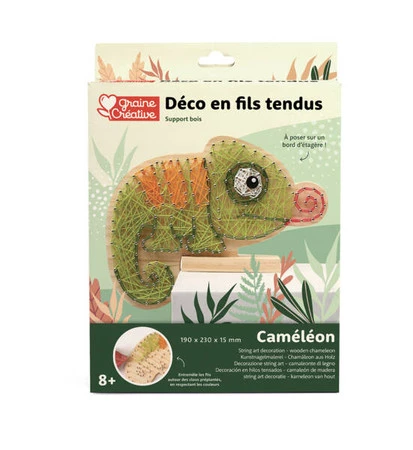 Bazą obrazka jest drewniana deska z już wbitymi gwoździkami tworzącymi wzór do wypełnienia muliną. Kameleon posiada drewniany stojak dzięki któremu można postawić gotowy obrazek na krawędzi półki (ma zwisający ogon). W zestawie znajduje się mulina w odpowiednich kolorach, ale można użyć również innych sznurków, kordonków i włóczek aby dostosować ozdobę do naszego gustu. Z tyłu opakowania znajduje się instrukcja obrazkowa krok po kroku.