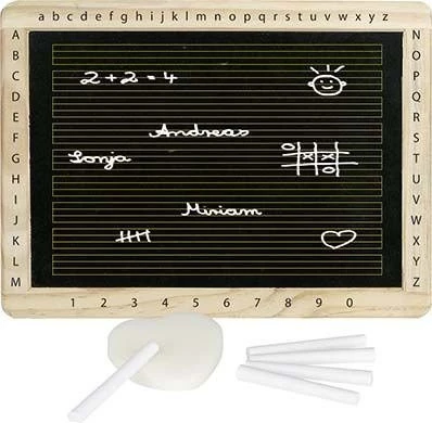 Drewniana tablica kredowa dwustronna - z jednej strony są linie ułatwiające pisanie, z drugiej tablica jest czysta. Na drewnianej ramce tablica posiada wypisane litery duże, male oraz cyfry.