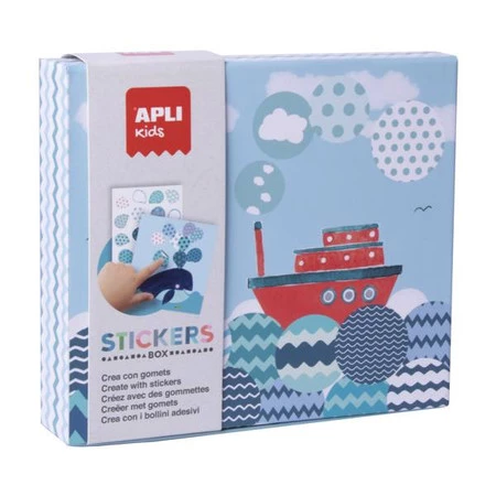 Zestaw z naklejkami w kartonowym pudełku Apli Kids. Celem zabawy jest uzupełnienie plansz odpowiednimi naklejkami, pasującymi do przedstawionej ilustracji. Naklejki są wielokrotnego użytku, dzięki czemu dziecko może je odkleić w razie pomyłki. Zestaw został opracowany przy wsparciu pedagogów i posiada wartości dydaktyczne: stymuluje zdolności motoryczne, rozwija myślenie matematyczne, pomaga w koncentracji, działa na koordynację ręka-oko oraz rozwija orientację przestrzenną. Kompaktowe opakowanie sprawia, że zestaw świetnie sprawdzi się w podróży.