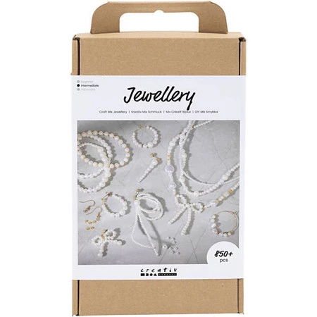 Dzięki temu zestawowi możesz stworzyć biżuterię z koralików imitujących perły. Zestaw zawiera wszystkie potrzebne materiały i instrukcje. Wszystko, czego potrzebujesz dodatkowo, to 3 narzędzia: cążki do drutu, szczypce płaskie i szczypce okrągłe.