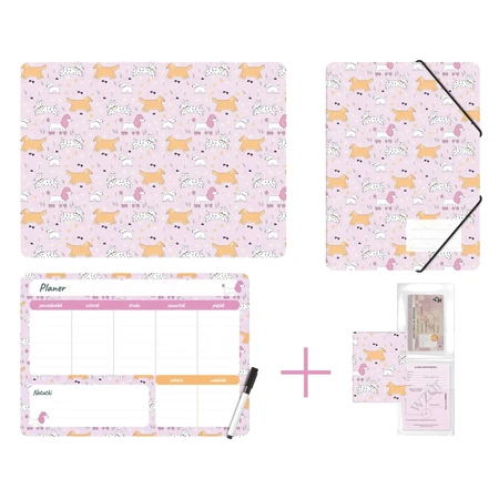 Zestaw szkolny składający się ze starannie dobranych akcesoriów, które sprawdzą się zarówno podczas zajęć plastycznych, jak i codziennego planowania nauki. W skład zestawu wchodzą: podkładka do prac plastycznych A4, teczka z gumką A4, planer magnetyczny z markerem oraz GRATIS – pionowa okładka na dokumenty ucznia. Produkty wykonane są z wytrzymałego tworzywa, które zapewnia odporność na zarysowania i długotrwałe użytkowanie. Komplet łączący funkcjonalność z atrakcyjnym designem, dostępny w 5 unikalnych wzorach do wyboru – dopasowanych do różnych gustów i stylów. Gotowe rozwiązanie, które oszczędza czas przy kompletowaniu wyprawki, a jednocześnie w pełni odpowiada na codzienne potrzeby każdego ucznia – zarówno w szkole, jak i w domu.Format